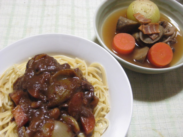 そんなわけで、この日は冷凍ストックのカレーをパスタと合体。副菜は野菜とパンチェッタを使ってポトフを。試しにポトフにゴボウを使ってみたら、意外にイケますね。目から鱗かもww