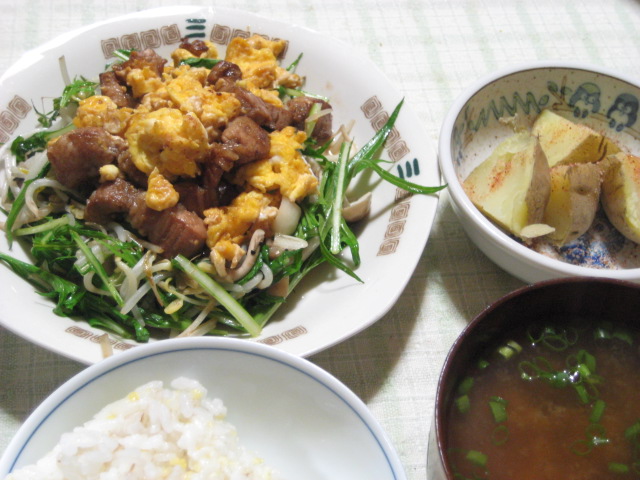 昨日の夕飯(11/5):もやしと水菜の炒めものカリカリ豚肉と炒り卵のせ他