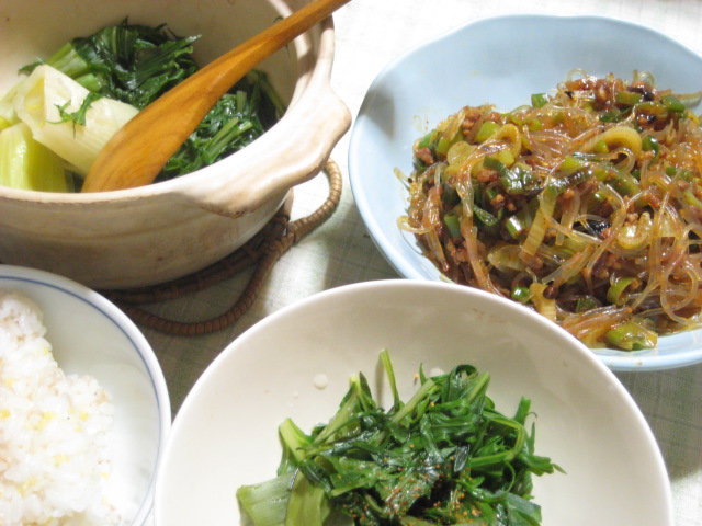 この日は久しぶりにマーボー春雨を作ってみました。それだけだとちょっと野菜分が足りないなと思ったので、汁物も兼ねて蒸し鍋。たまたま下仁田葱をもらってたので、それと水菜だけというシンプルなものですが、美味しかったです。