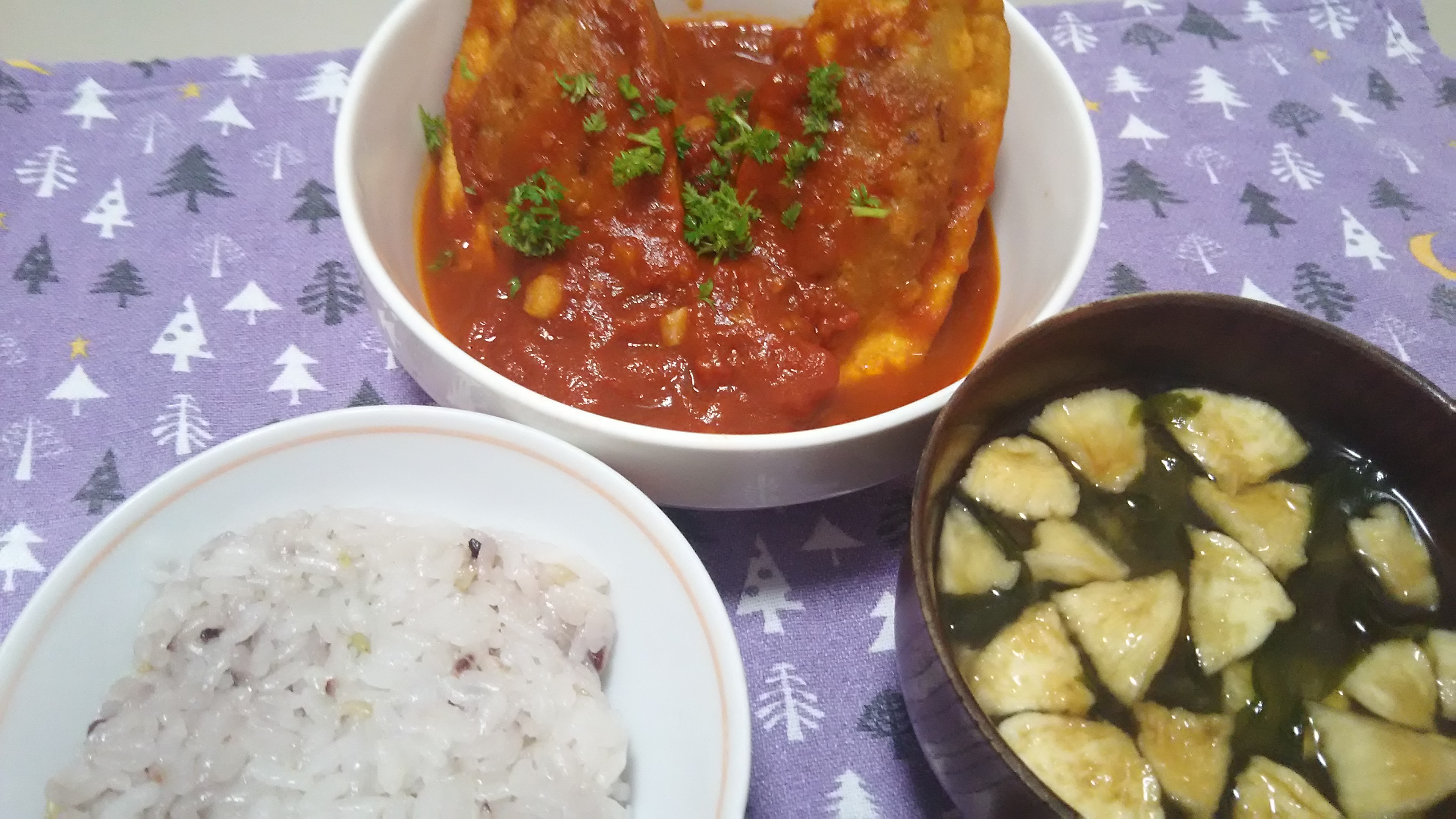 昨日の夕飯(2/6):厚揚げの挽き肉詰めトマト煮込み他