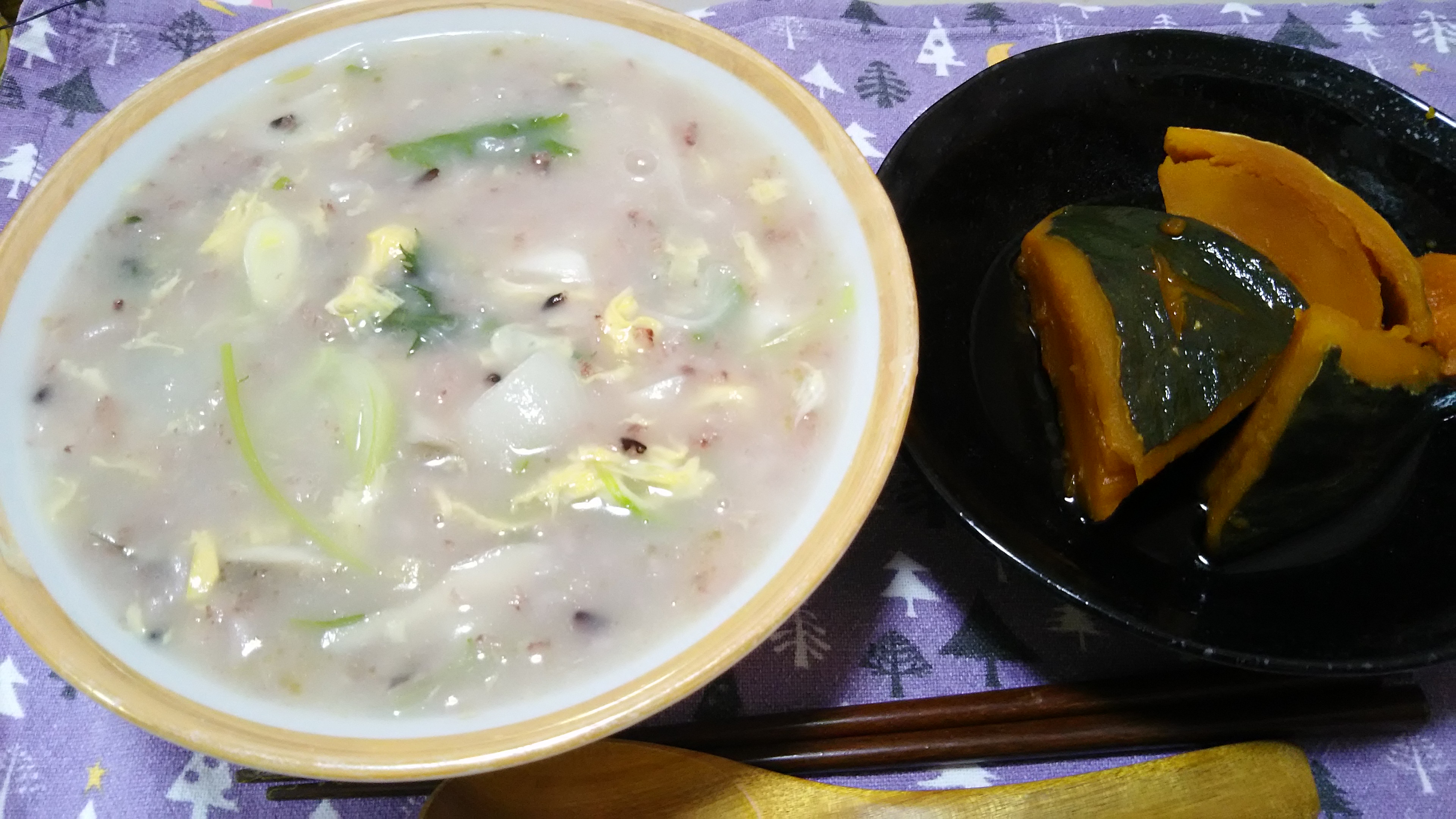 普段なら、米から煮て中華粥は作るんですが、この日は前日炊いたご飯が余ってたので、それを使って。微妙に色付きなのは、黒米を混ぜたご飯だったからです(笑)