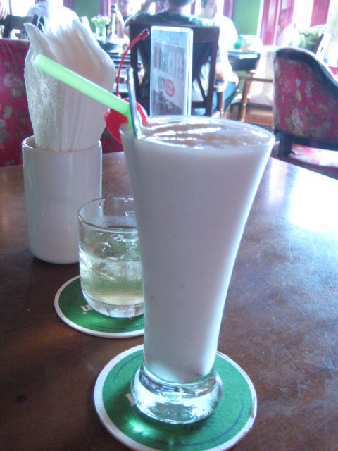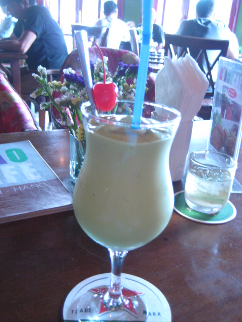 ここでは、シントーを注文しました。シントーというのは、ベトナム風のフルーツシェイクのような飲物ですね。あちらでは街角でもジューススタンドなどでも飲めるらしいですが、そういえば今回歩いてる時にジューススタンドや屋台は見かけなかったなぁ…(バックパッカー宿が集中してるデタム通り辺りなら、結構あるのかも)。