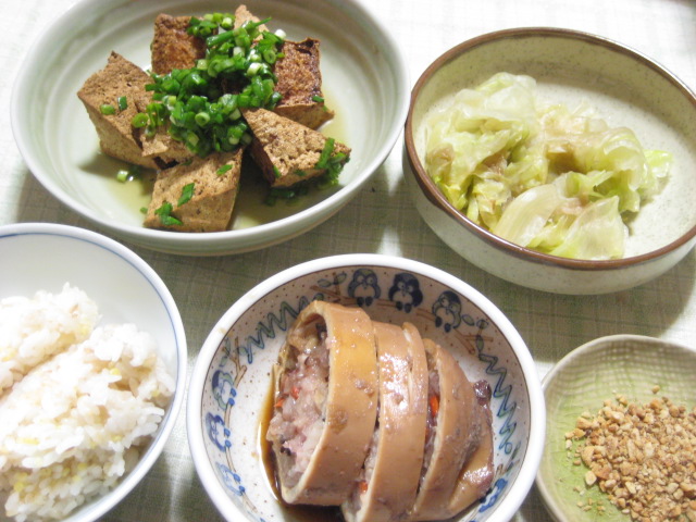 イカめしはこの間もらったものの残り。大根と天ぷらの煮物は冷凍ストック品の大根を使って。これ、火をある程度入れたものを冷凍しているので、煮物を作る際に通常よりも短時間で出来るし、何よりも一旦凍らせることで味を含みやすくなるので、かなり重宝です。生の大根を長い間放置して、すができてしまったり、腐らせてしまうなどで無駄にせずに済むので、一石三鳥くらいのメリットはあるかと思いますよ。