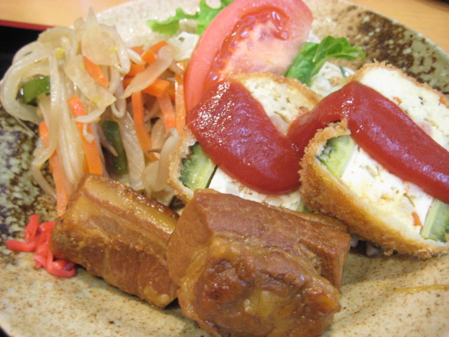 で、ランチですが、4~5種類ほどあるランチメニューの中から、日替わり定食をチョイス。この日のメインはラフテー、ゴーヤの豆腐詰めフライ、麩チャンプルー。ラフテーは箸で簡単に切れるほど柔らかくて、美味しかったです~♪