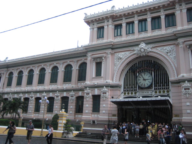 ホーチミンに到着して、速攻市内観光(とはいっても、ごく簡単なもの)に連れて行かれました。まず最初に向かったのが、この中央郵便局と隣接するサイゴン大教会。移動中に激しい雨が降っていたので、到着時には上がっていたとはいえ、しっかり曇ってますwホーチミンは雨季と乾季があるそうで、時期的にはそろそろ雨季が終わりのはずなんですが、今年はまだ続いてるようで…(とはいえ、スコールのように1時間ほど、ドッと降って上がるという降り方なので、結構やり過ごせますよ。ここは飛び込めるカフェとか多いですしね)滞在中は夕方と夜の二度降ってましたね。昼間は降ってなかったなぁ。