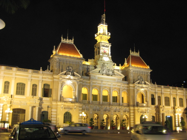 途中、人民委員会に立ち寄って撮影。こんな風にホーチミン市内の有名建築は夜にライトアップされていて、とても綺麗です。