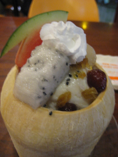 で、これがガイドブックに必ず載ってるココナツの殻にアイスとフルーツをトッピングしたやつ(メニュー名忘れたw)。値段は85000VND(日本円で400円くらい)です。ココナツアイス、スイカドラゴンフルーツ、リュウガンなどに甘く煮たドライフルーツ(ナツメなど?)をトッピングしてあって、バニラアイスほど重くなくて、美味しかったですねー♪しかも、殻の内側にはココナツの実が当然ついているので、それも掬いながら食べるので、クニクニの食感が実に面白いし。