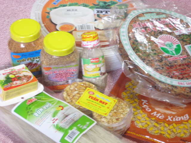 写真は現地でゲットしてきた食品の一部。前回スーパーで見つからなかったライム塩も買うことができたし、ライスペーパーや米粉を使ったお菓子類も何点かゲットできましたよ。