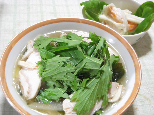 で、この日の汁は、鶏ハムを作った際の茹で汁をベースに、ニョクマムなどで味付け。あと、食べる際に途中で柚子を絞って食べましたが、これも向こうでは味に変化をつけるために、酢を加えたり、チャインというライムのような果物を搾ったりして食べるのに習ってみました♪まぁ、具は大根だったりワカメだったりと、自分流ですがw