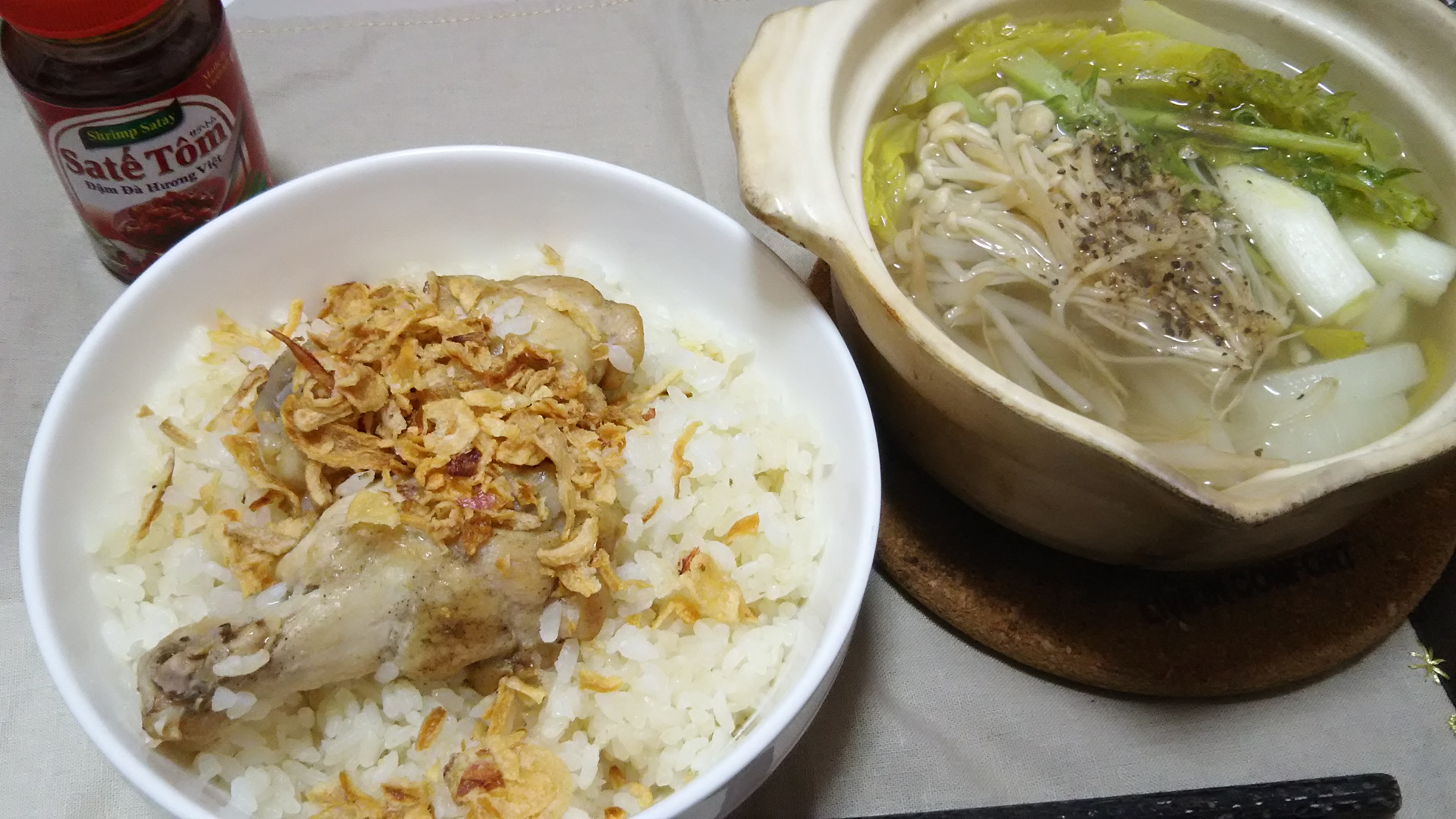 この日は冷凍ストックのチキンライスに、スープを兼ねた野菜の小鍋で。