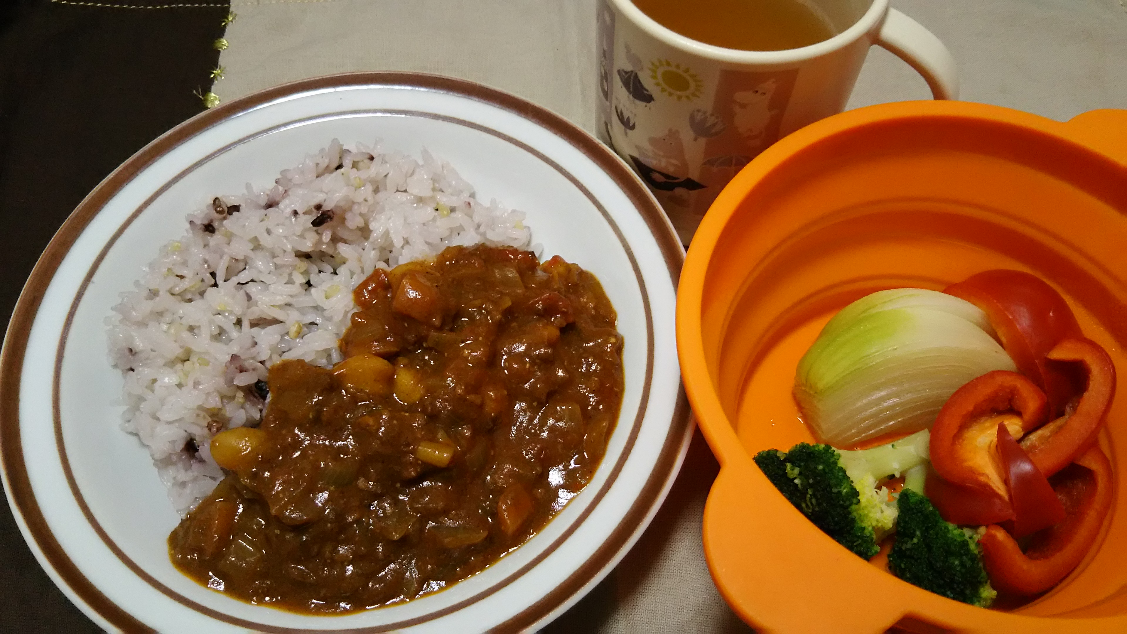 キーマカレー、蒸し野菜、市販のコンソメスープで。