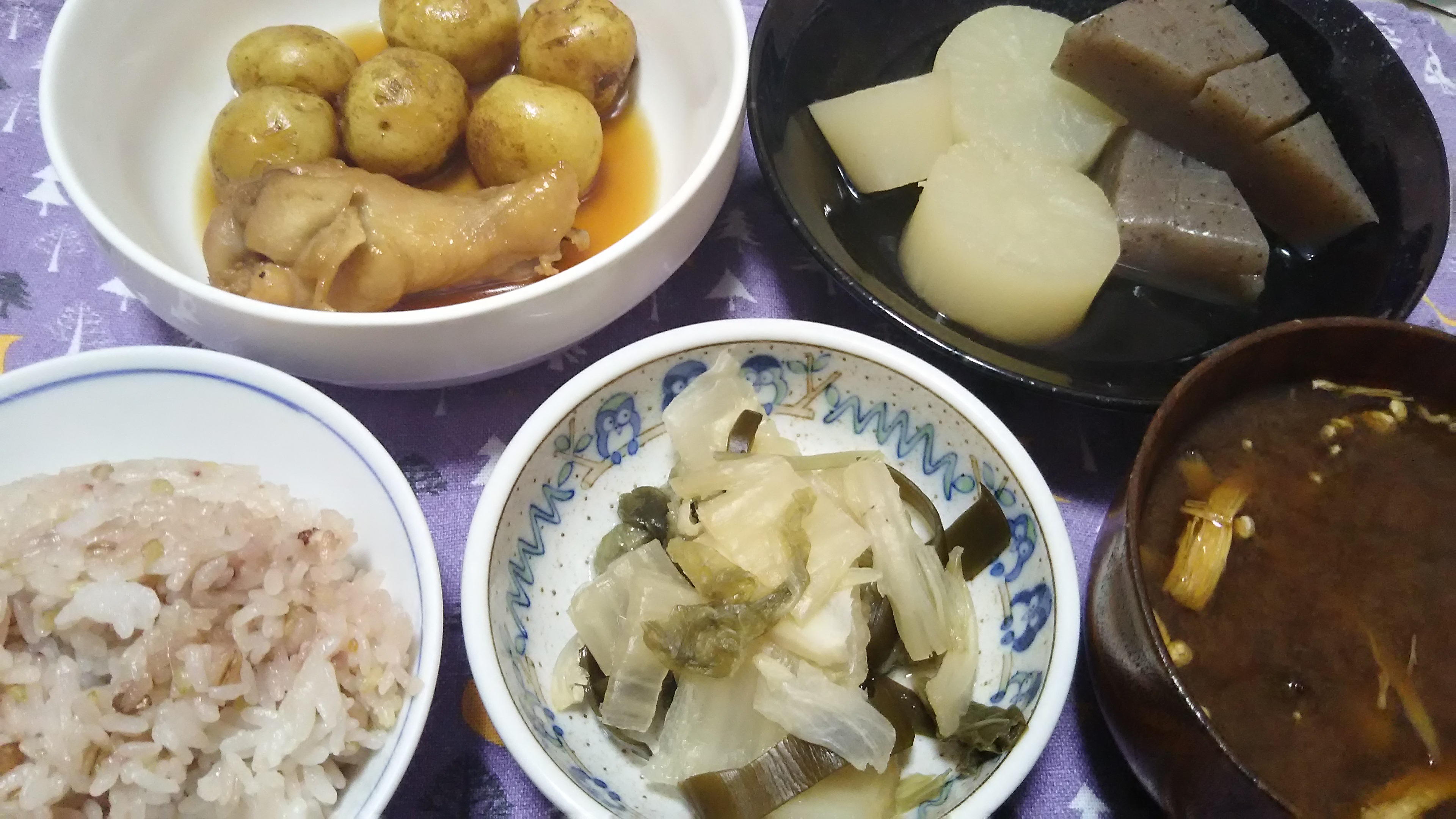 この日の夕飯は、新じゃがの煮ころがし、大根とこんにゃくの炊き合わせ、水キムチ、干しエノキの味噌汁。