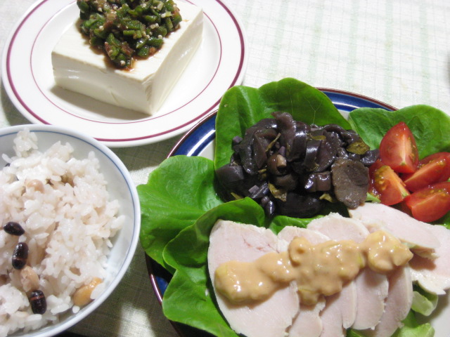 副菜はナスのビネガーソテー、刻みオクラのせの冷奴。ご飯は十六穀米のをもらったので、それを食べました。