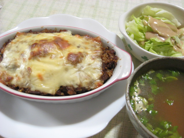この日は一昨日のチキンカレーをリメイクしたドリアに。簡単に済ませたので、カレーとご飯を混ぜたものに、とろけるチーズを載せて焼いただけという、単純なものですが、ちょっと豪華にするなら、コーンなどの具材をプラスしてもいいかも。