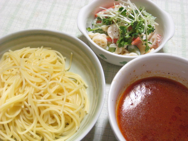 この日は前に食べて、半分残ってたつけパスタのソースを整理したかったので、つけパスタです。副菜はマカロニ入り野菜サラダ。パスタのボリュームが少なくて、物足りなくなりそうだったので、急遽マカロニ追加www