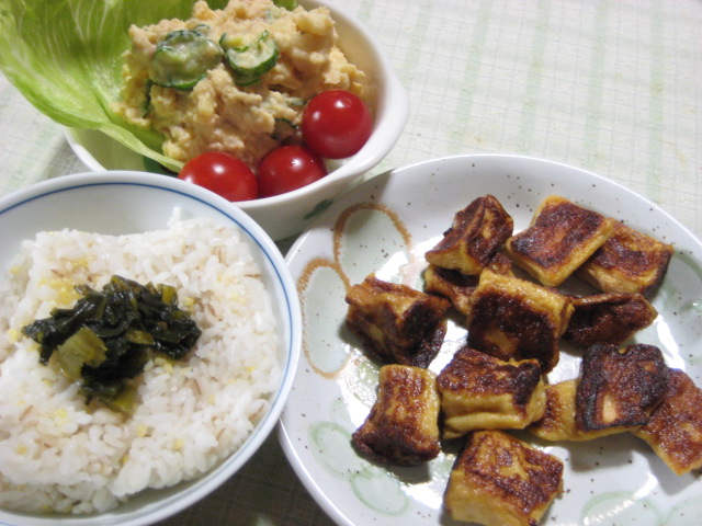 この日の夕飯は麩チャンプルー、ポテトサラダ、野沢菜の漬物。