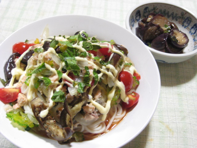 汁はトマトベースにしたので、具も洋風に。鮭缶(水煮)、玉ねぎ、キュウリ、ナス、プチトマト、ゴーヤで。薬味にはバジルをトッピング。