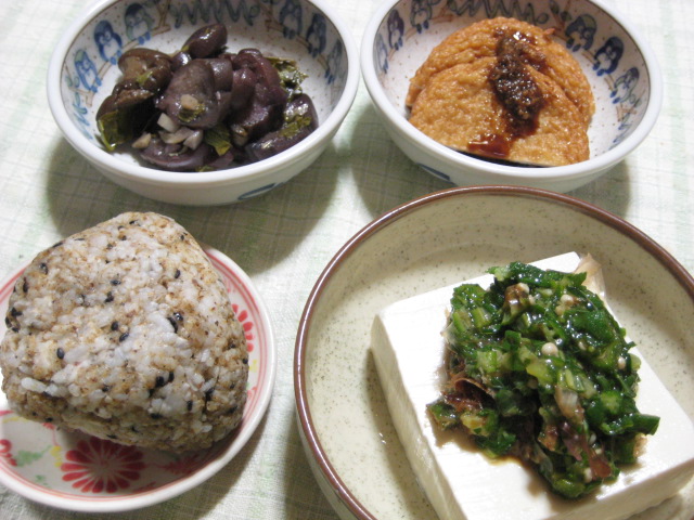 そんなわけで、この日はその失敗ご飯のおにぎりも含めて、ありものメインで夕飯を取りました。冷奴の具はオクラとモロヘイヤをおかかとポン酢で和えたものを。醤油よりもさっぱりするので、暑さで食欲が落ちてる時にはいいですよ。副菜は作り置きのナスのビネガーソテーに、昨日の天ぷらの残りで。