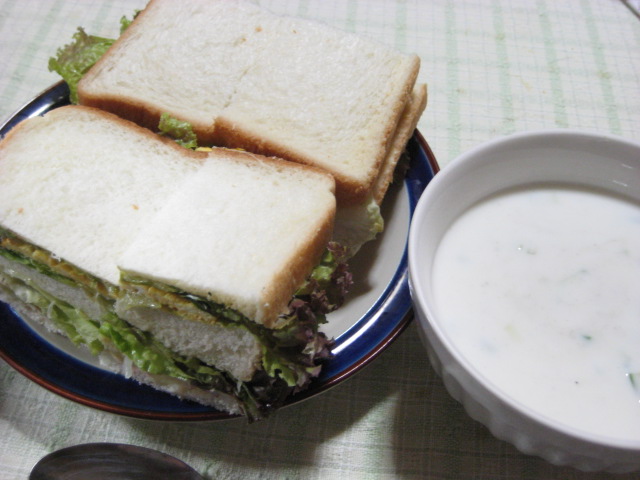 サンドウィッチは卵サンドとタラモサンドで。スープはキュウリ入りの冷たいヨーグルトスープ。