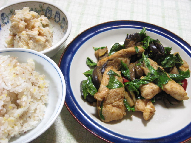 昨日の夕飯(8/15):ナスと鶏胸肉のバジルカレー炒め他