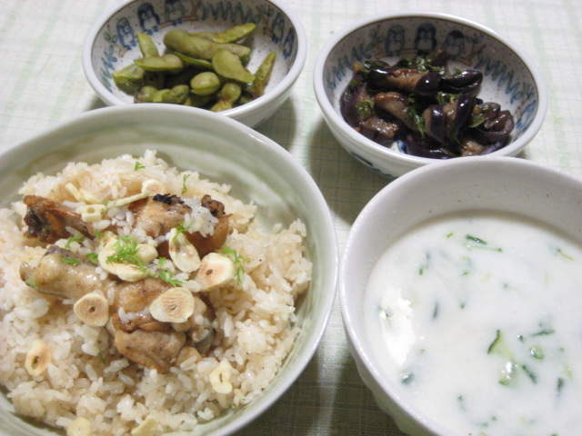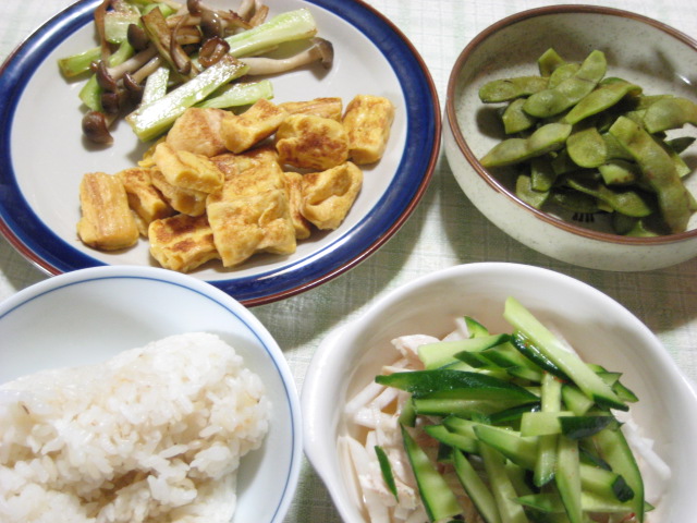 副菜のうち、ナスのビネガーソテーは、生のナスを輪切りにしたものをこの夏から冷凍ストックするようになったんですが、非常に便利です。冷蔵庫だと時間が経つごとに風味も落ちるし、栄養も損ないますが、冷凍だとその心配もほとんどない上に、一度凍らせることで、レンジでチンするのと同じ効果が得られます。つまり、炒め物などに使うと、油を使いすぎずに済むのです!これが一番のポイント!!
