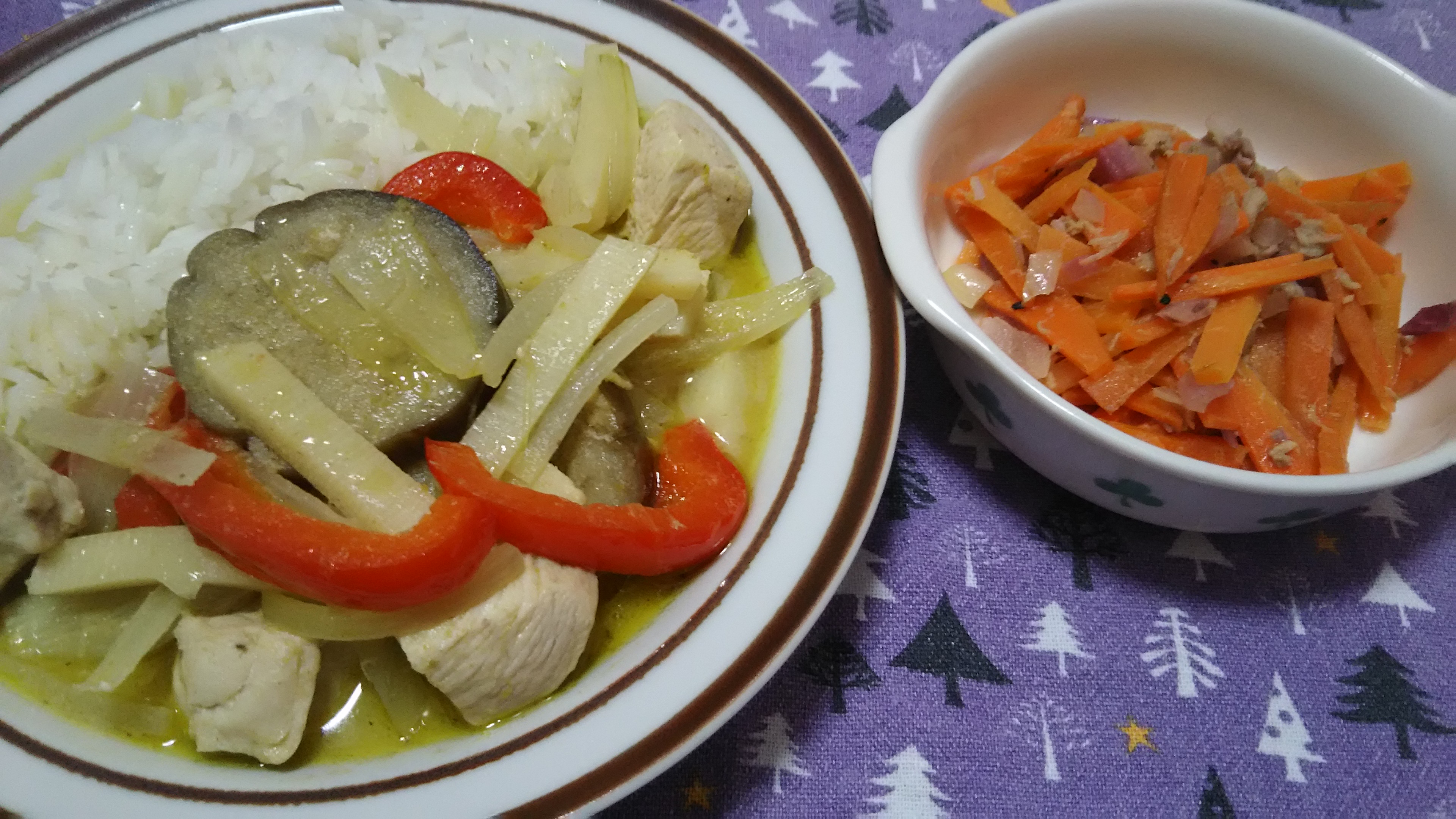 この日は冷蔵庫と冷凍庫のストック食材でグリーンカレーと、作りおきのニンジンサラダを。