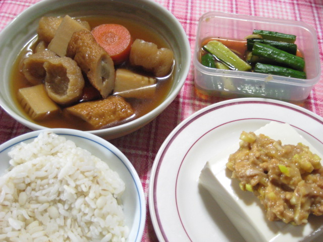 副菜は豆腐のネギ入り鶏味噌のせとキュウリの浅漬けで。