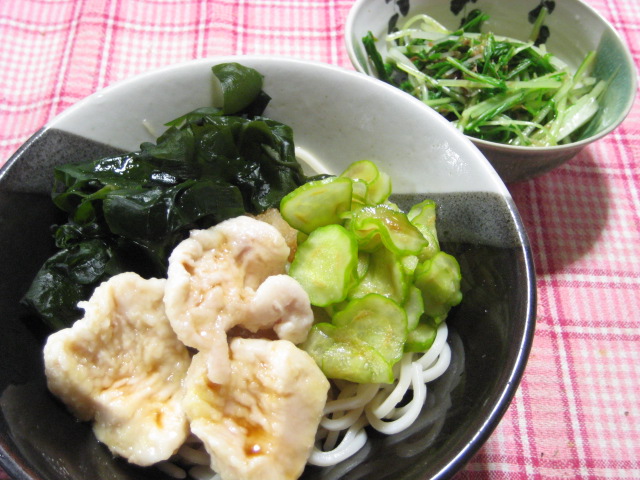 そんなわけで、今年初めての冷たい麺にしました。具は鶏むね肉の冷しゃぶ仕立て、ワカメ、きゅうりで。具の下に大根おろしをたっぷり敷いてあります。