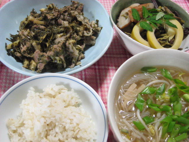 副菜はもらい物の山菜の炊き合わせ、汁物はミニ汁ビーフンで。
