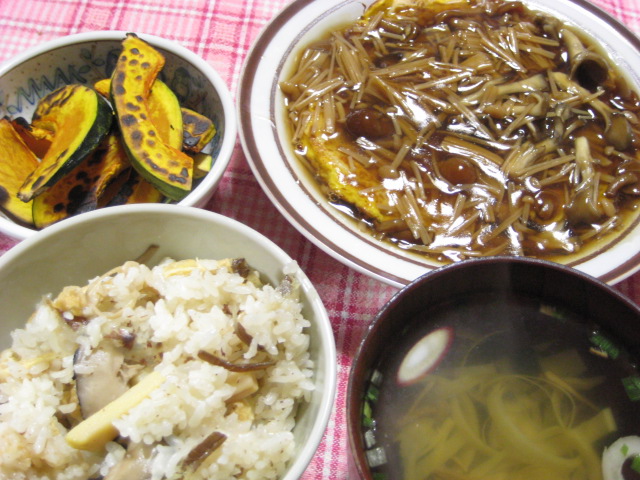 副菜は焼きカボチャ、汁物はタケノコ入りの吸い物。
