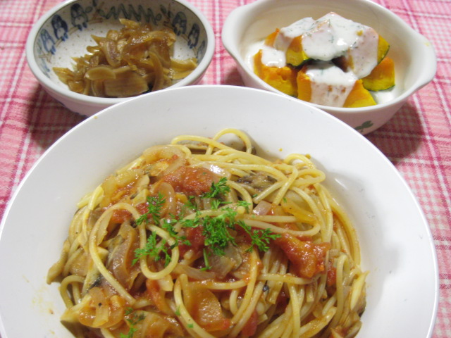 副菜は蒸しカボチャのヨーグルトソースかけ、新玉ねぎの甘酢漬けで。