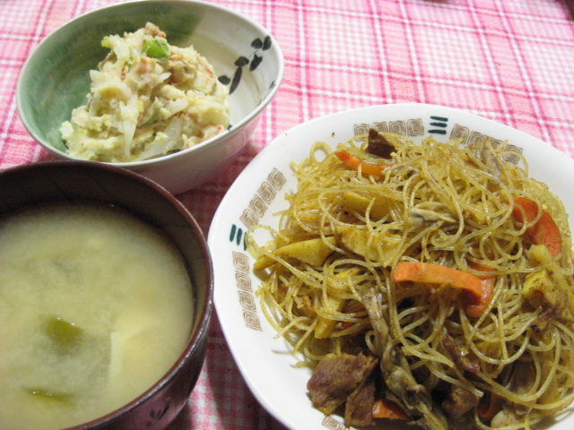 この日は前にビーフンを買っていたことを思い出したので、それにしました。具に使える野菜の種類がなかったので、味付けをカレー味に。