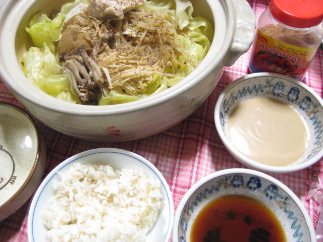 この日は前日に残った野菜の整理を兼ねての蒸し鍋です。普段は一人用の小さい鍋で一品としてやるくらいなんですが、この日はこれのみってことで、大きな土鍋で。肉類はブリを塩麹に漬けておいたのを、今回はじめて使ってみました・・・が、これが想像以上に美味しかった!つけダレとしてバーニャカウダ、ポン酢、エビ塩を用意してみたんですが、魚が一番美味しかったのはエビ塩ですね。野菜はどれも合いました。