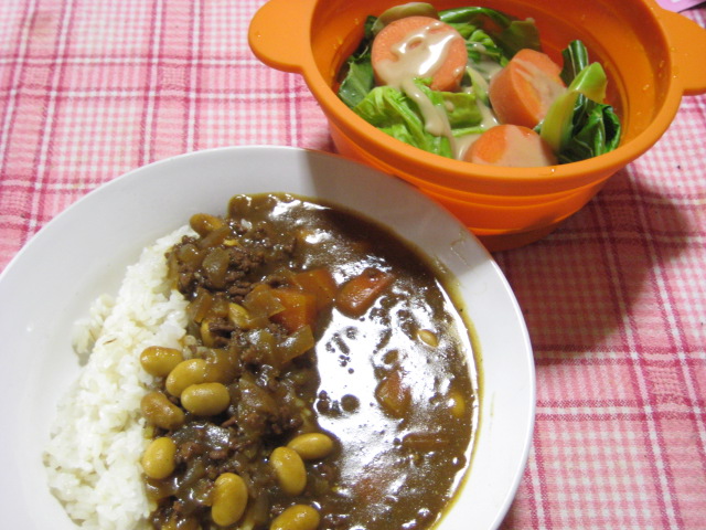 あと、この日は前日のカレーが若干残っていたので、ご飯は一膳サイズにおいてカレーも食べました。冷凍ストックが空きの関係でそれほどできなかったので、しわ寄せがwww