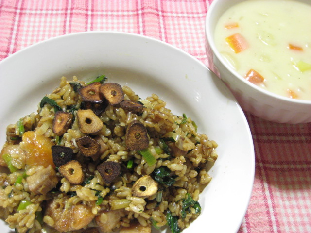 昨日の夕飯(12/8):ほうれん草と豚肉のガーリック炒飯他