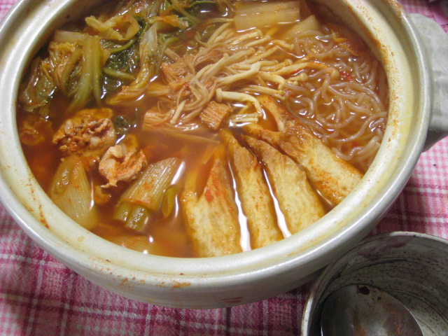 市販の汁はまだ買ってなかったので、汁は自作。ベースはかつおだしと鶏がらスープ、コチュジャンにキムチとその漬け汁、酒、醤油、粉唐辛子があれば、結構美味しいのが作れますよ。