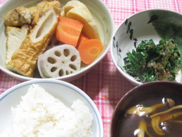 おかずはアジの干物、ほうれん草のゴマびたし、レンコンの味噌汁で。