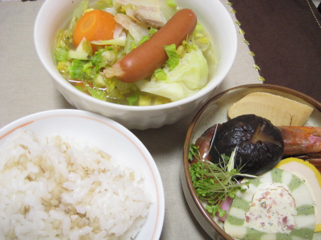 おせち料理だと、どうしても野菜不足が否めないので、この日はポトフを追加して。とはいえ、おせちという割としっかりした副菜があるんで、肉類は少なめ。具だくさんの野菜スープに近いのかな。