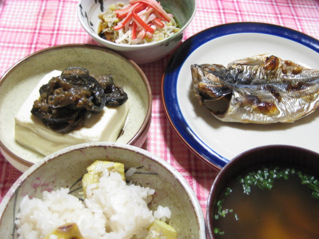 というわけで、栗ご飯とケンカしないメニューを・・・アジの干物、温奴の茄子の味噌炒めのせ、カニかまともやしの酢の物、わかめの味噌汁で。