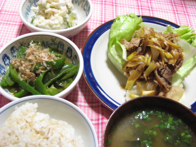 副菜はピーマンのおひたし、ポテトサラダの残り(ちょっと食感に滑らかさが足りなかったので、ヨーグルトを足して緩めました)、汁物はわかめの味噌汁で。