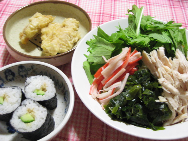 これだけだと物足りないので、キュウリ巻きと鶏胸肉の天ぷら。これはできあいです。