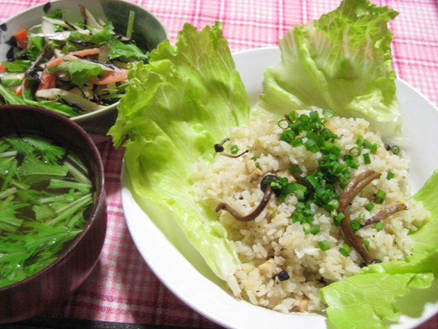 塩漬けの鶏むね肉を使ったピラフ(レシピ公開中)、ゴボウとヒジキのサラダ、水菜とワカメの味噌汁