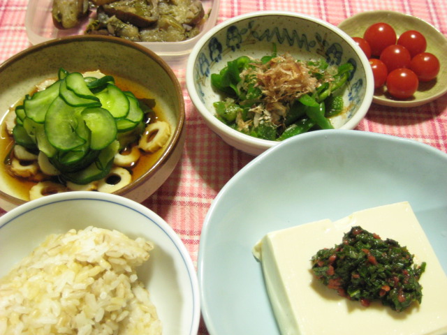 冷奴はつぶし梅干とたっぷりの青シソで。酢の物はワカメとキュウリとちくわ、ピーマンのおひたし、茄子のビネガーソテー、プチトマト。