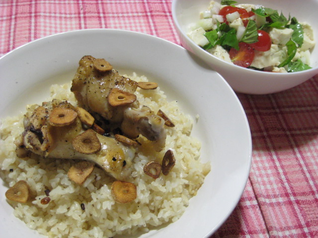 副菜はトマトとバジルと豆腐のサラダ。これも生バジルが収穫できる今しか作れない、夏の味ですね。あとは、これにビールでもあれば・・・!(笑)