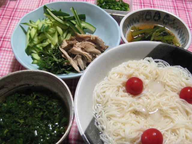 素麺は普通にするとどうしても、栄養バランスが悪いので、特に野菜を意識して具を準備。青ネギやシソという定番以外に、キュウリ、モロヘイヤ、蒸し鶏、あと飾り用としてトマトも。
