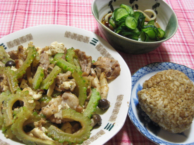 ゴーヤチャンプルは今回、卵抜きで。副菜はキュウリと切り干し大根の酢の物。ご飯は冷凍していた削り節のおにぎりで。