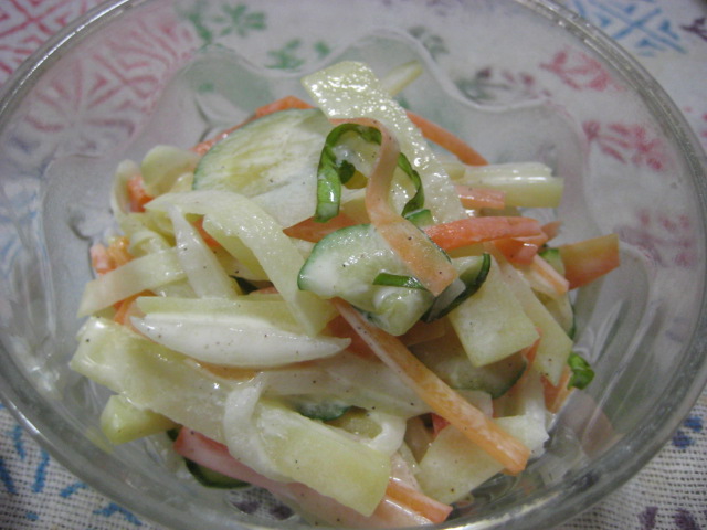ここでは炭水化物を控えめにということで、ジャガイモは控えめですが、好みで大根かキュウリを控えめにして、その分ジャガイモを多くしても。実際、ジャガイモが多めの方が、余分な水気が出にくいのでタッパーなどで保存すれば2~3日は美味しく食べられますよ。