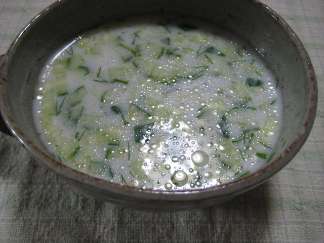 キュウリとヨーグルトの冷製スープです。元々、ブルガリアの方でよくされている食べ方だそうで、あちらでは確か「ラタトール」と呼ばれてるのだとか。