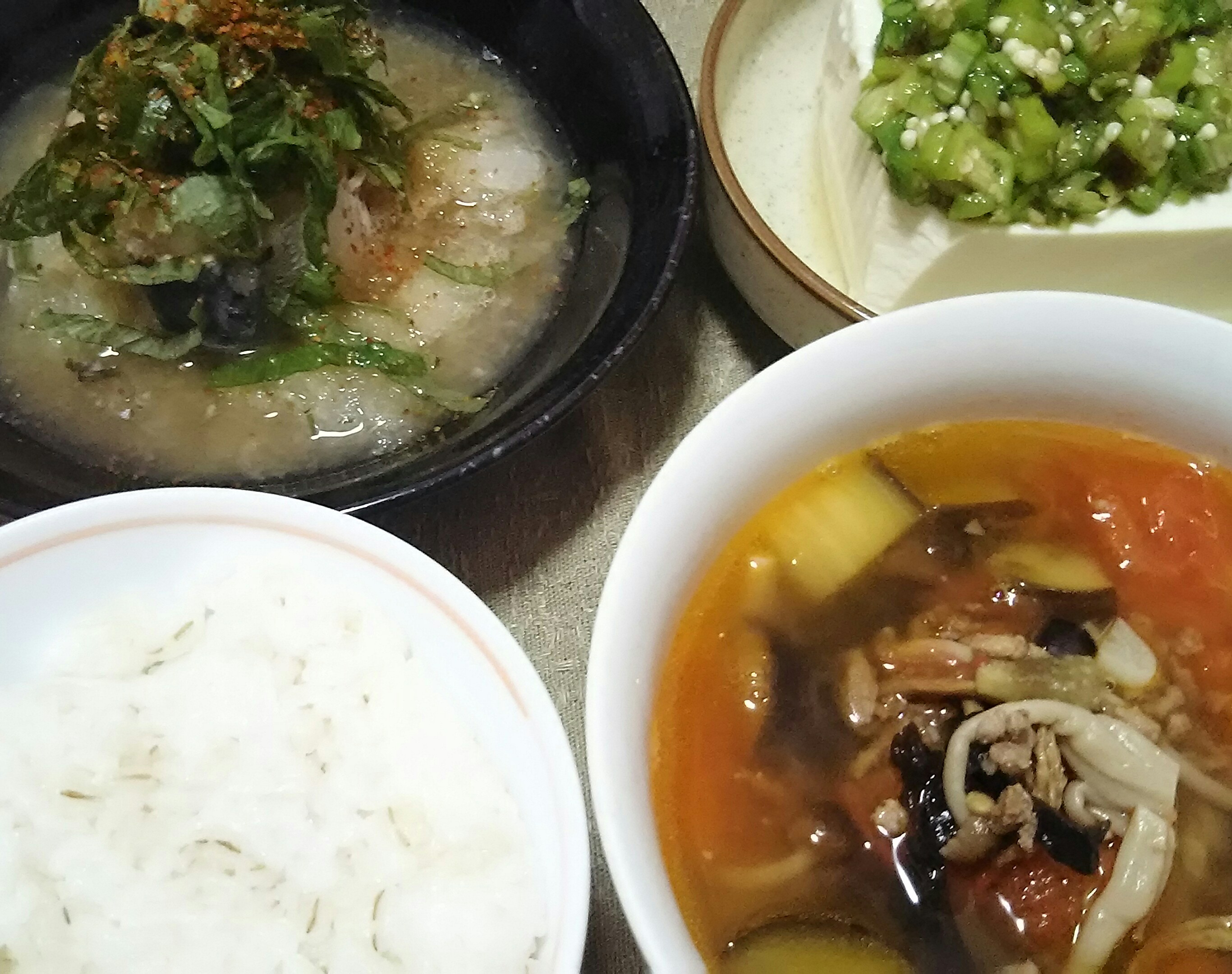 サバのおろしがけ、冷ややっこ(キュウリとオクラ、モロヘイヤ)、ひき肉と夏野菜のスープ