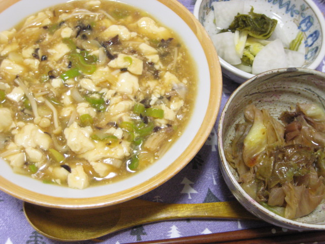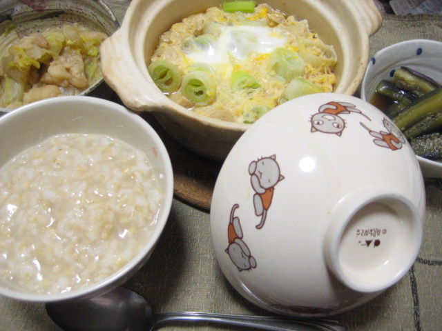 レトルトの玄米粥があったので、主食はそれにして、おかずはメインに氷豆腐の卵とじ、副菜は白菜の煮物(作り置き)と、蒸し茄子の生姜びたしで。